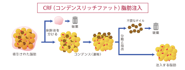 「脂肪採取・注入(コンデンスリッチファット)」は、自身から採取した脂肪を良質な脂肪のみに分離し、気になる深いシワやくぼみ、凹みに注入することで肌にハリをもたせ改善させる方法です。