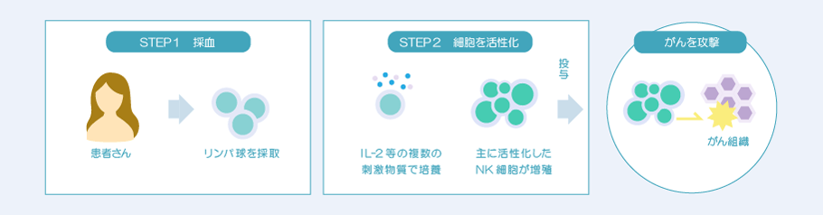 常に体内をパトロールし、がん細胞を見つけると攻撃を開始し、破壊します。末梢血中に含まれるNK細胞を中心とした免疫細胞をIL-2などで刺激し、活性化、増殖させ、体内に戻す治療法です。