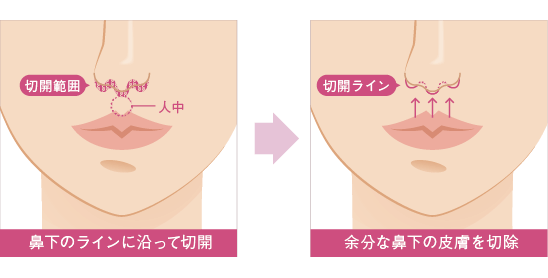 Chỗ lõm theo chiều dọc ở giữa môi trên bên dưới sống mũi được gọi là nhân trung. Phẫu thuật cắt bỏ sụn là phương pháp tạo một vết mổ ở cơ tự nhiên giữa mũi và môi trên, giữa cánh mũi và má, đồng thời cơ orbicularis oris được kéo vào đáy xương vách ngăn mũi. Bằng cách loại bỏ da, chiều dài của mũi dưới được rút ngắn, môi trên được nâng lên và dày lên, mang lại vẻ ngoài trẻ trung hơn. Không chỉ giúp giảm bớt sự lỏng lẻo của người già mà ngay cả những người trẻ tuổi cũng có thể làm thon gọn khuôn mặt thon dài của mình bằng cách thu ngắn vùng dưới mũi một cách thích hợp.